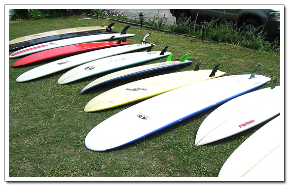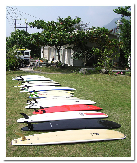 大家抵達民宿後.. 紛紛把衝浪板一字排開晾在草地上..