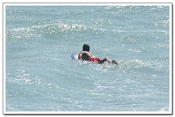迎面騎著腳踏車過來低local看到車上有衝浪板..