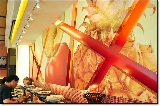 左: 新鮮的沙拉BAR,擺放生菜的容器看起來超有質感~