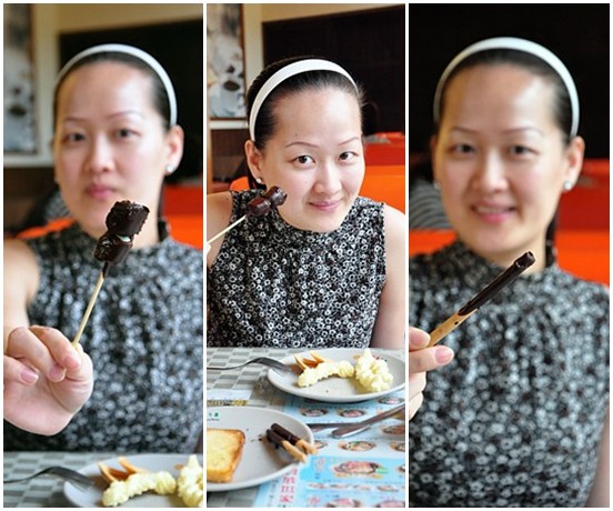 看左邊這位小朋友多們認真地沾巧克力~![]()