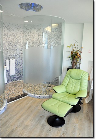 內部的瓷磚用藍白漸層鑲嵌而成,