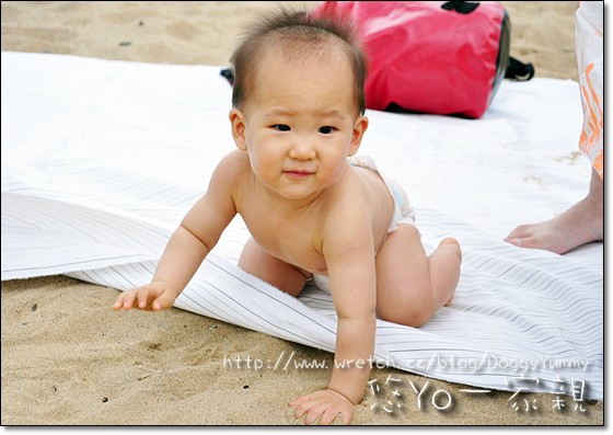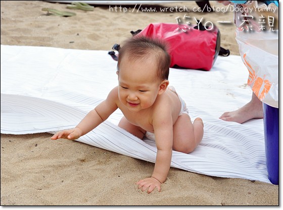所以直接在沙灘鋪上防水布~ 就讓YoYo在上面爬爬爬~