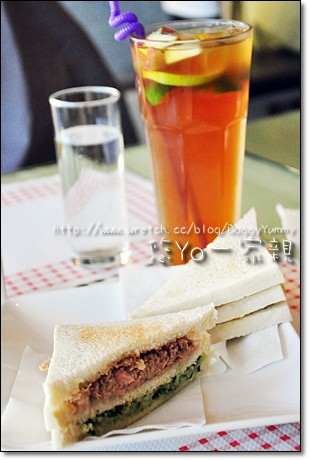 終於決定點一杯水果茶(100元)和鮪魚三明治(60元)