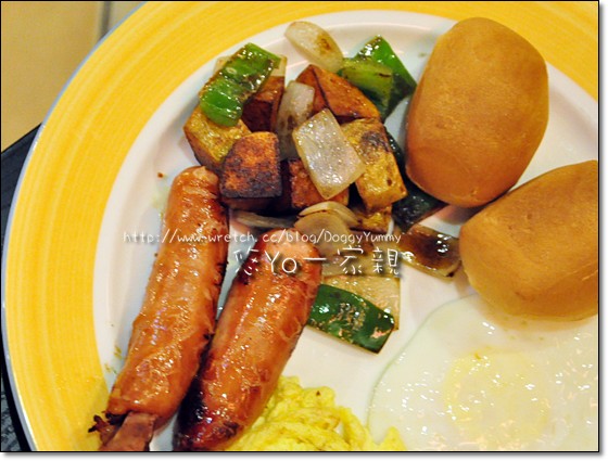 看起來好豐盛~ 有兩隻很豪邁的帶骨香腸 太陽蛋 炒蛋 馬鈴薯塊 和兩個餐包~