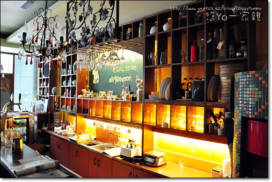 吧檯後方整面的壁櫃擺滿各種碗盤 器皿和調味料~