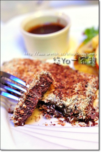 牛排的表面還裹上一層白色的麵包粉挺搶眼低~