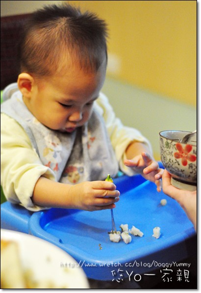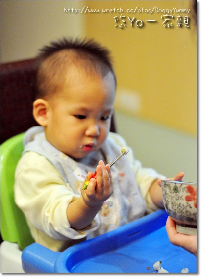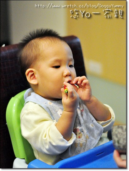 小銳再享用蔥化大餅的時候YoYo在一旁一直啊啊啊討東西吃~
