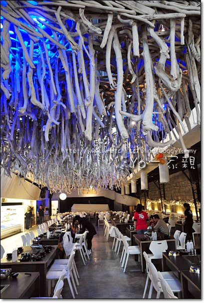 天花板大片的漂流木和藍色燈光營造出既前衛又時尚的空間風格~