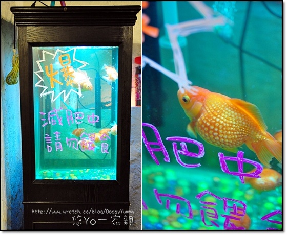 水族箱的玻璃上還逗趣的手寫"爆"減肥中請勿餵食~