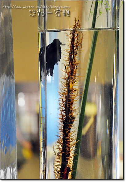 吧台上的長柱玻璃杯有隻高貴的黑孔雀魚在裡面優游~