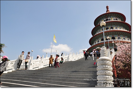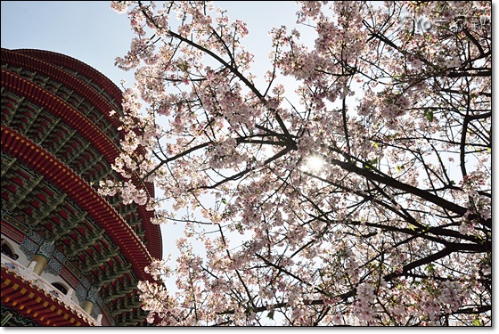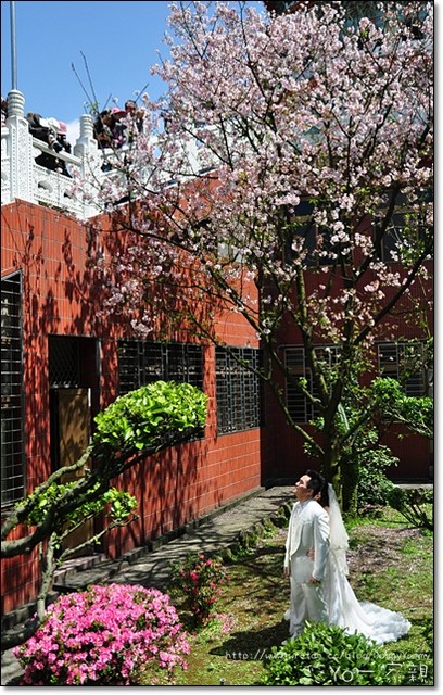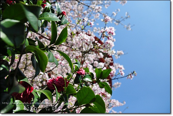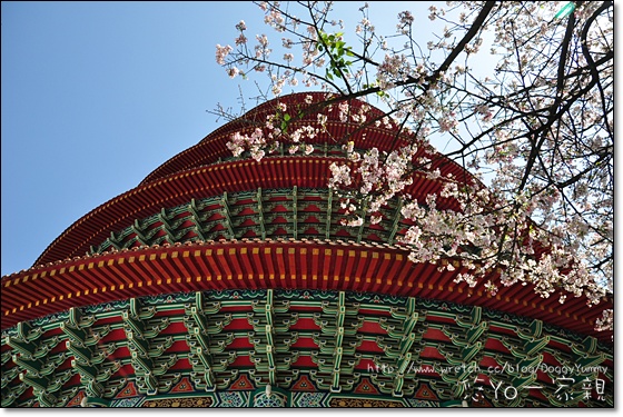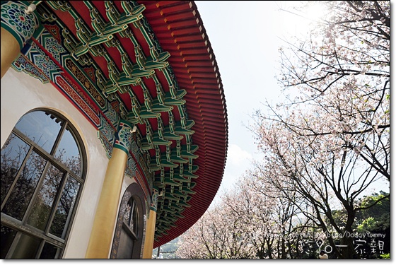 天元宮紅色的屋頂和粉紅色櫻花構成相當美麗的畫面~