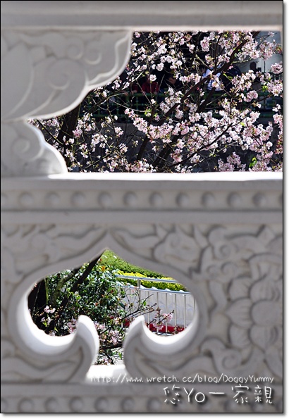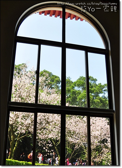 透過天元宮內的窗戶欣賞窗外的櫻花別有一番風味~