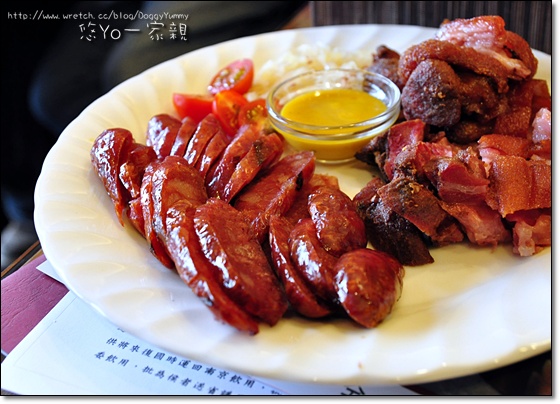 有整盤片好的脆皮德國豬腳和紹興酒味香腸~