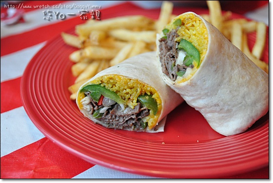 墨西哥餅皮裡面滿滿的牛肉 洋蔥 彩椒 和 一圈超香的黃薑飯~
