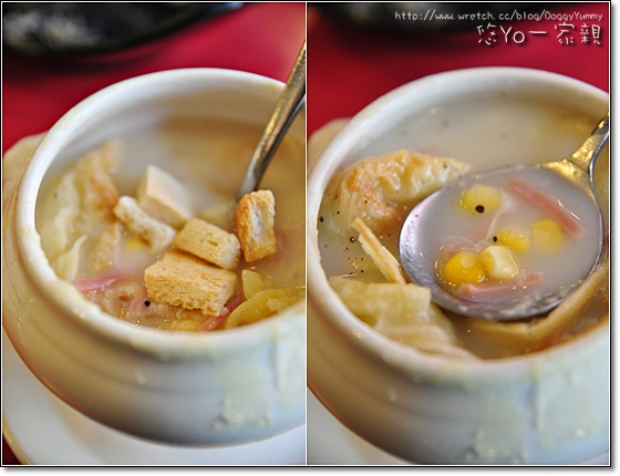 玉米濃湯濃稠度偏淡~ 餡料除了玉米之外還有火腿丁~