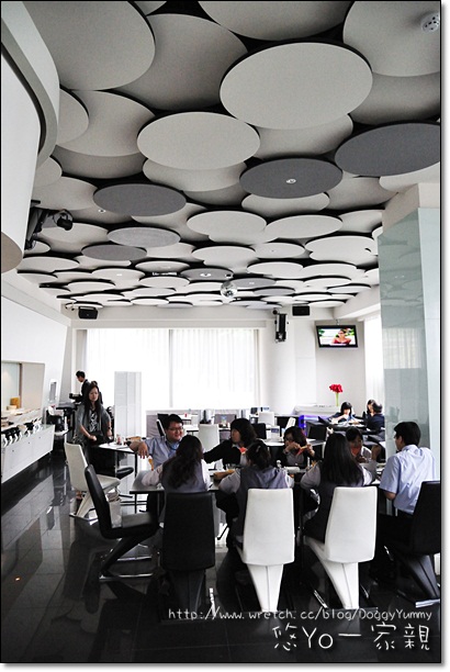 天花板黑白灰圓型的幾何造型層層相疊~ 很有特色~