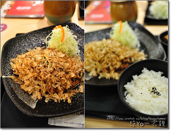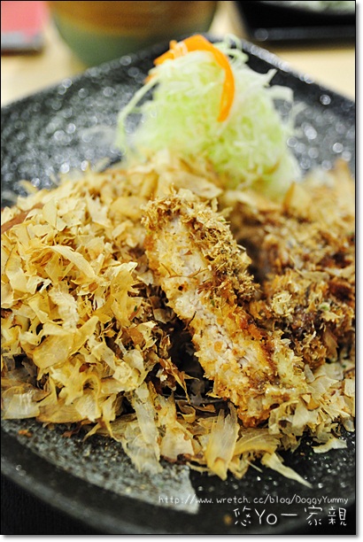 大量的柴魚片覆蓋在熱騰騰的豬排上~