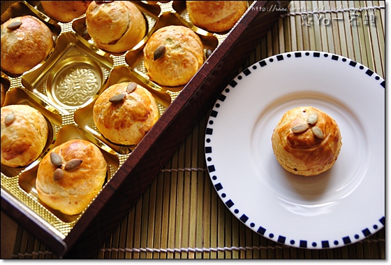 每顆金黃色的金瓜酥上頭還有南瓜子裝飾~