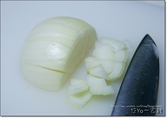 將對半的洋蔥切直刀,記得一邊不要切斷~