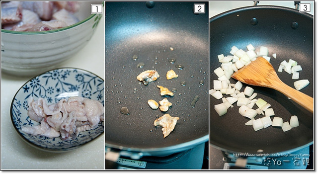 4. 將雞肉放入鍋裡翻炒到雞肉微縮
