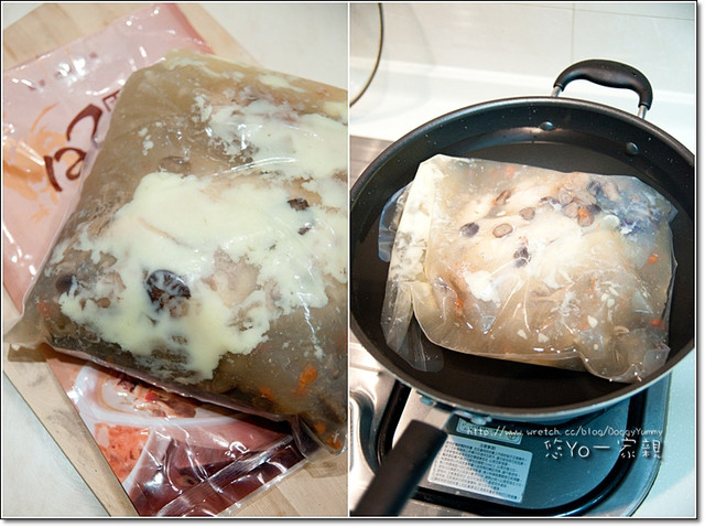 電鍋蒸煮-取下外袋,將內袋直接放入電鍋內鍋加熱,外鍋加入適量的水約蒸煮30分鐘即可