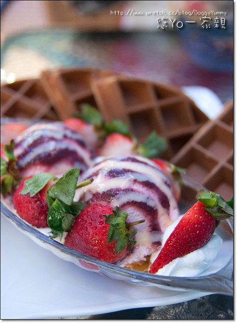 吃草莓冰淇淋配上鬆餅
