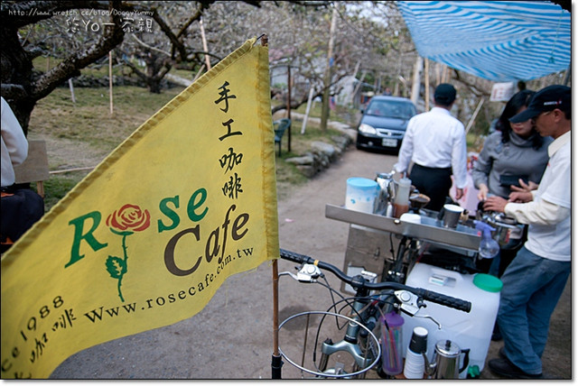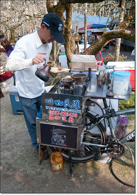 在停車場附近的賞梅布道內巧遇一位賣咖B的老伯~