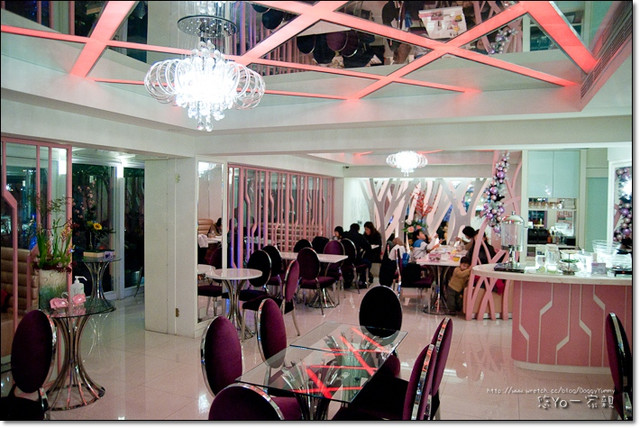粉白色系的裝潢搭配整片的鏡面天花板~