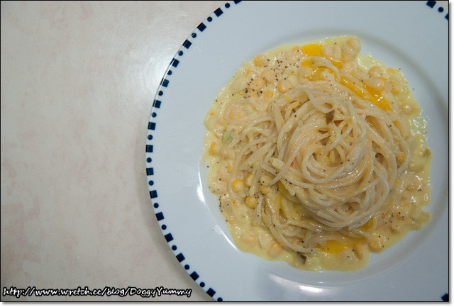 隔天午餐YYB又搬出香蟹南瓜濃湯,打算弄個創意料理-香蟹南瓜義大利麵~