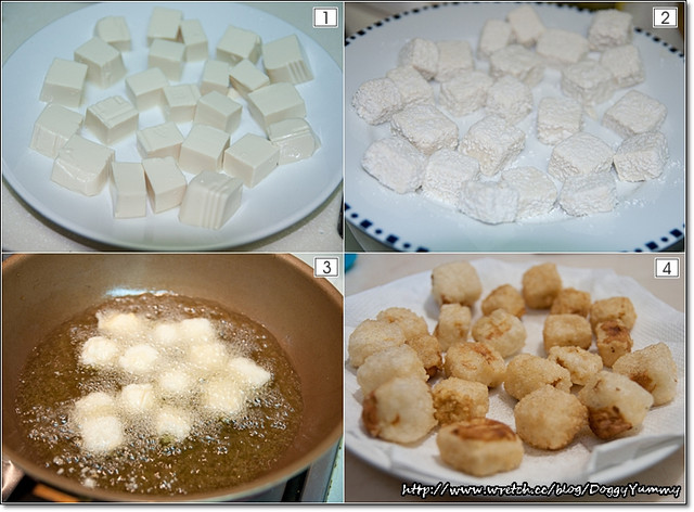 1. 將豆腐切成小塊靜置後將表面的水分擦乾