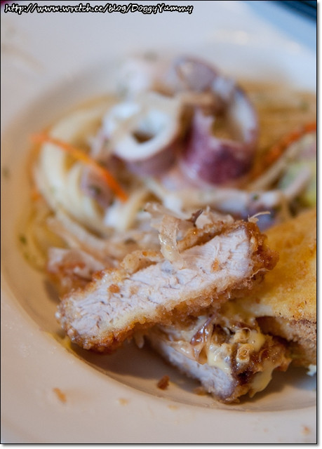 應該是煎過頭哩! 雞腿的肉質竟然有乾澀的口感 (囧)
