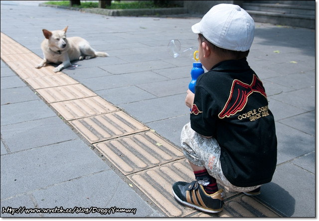 鬼靈精怪的yoyo看到路邊的流浪狗還說要吹泡泡給牠玩 XD