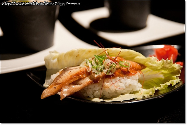 用新鮮的蘿美生菜包覆壽司飯和火烤鰻魚相當有創意~