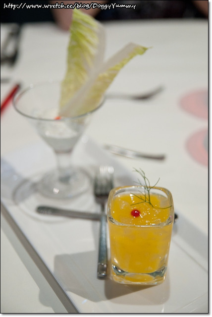 用高腳杯裝呈的新鮮蘿美心搭配煙燻鮭魚塔塔醬~