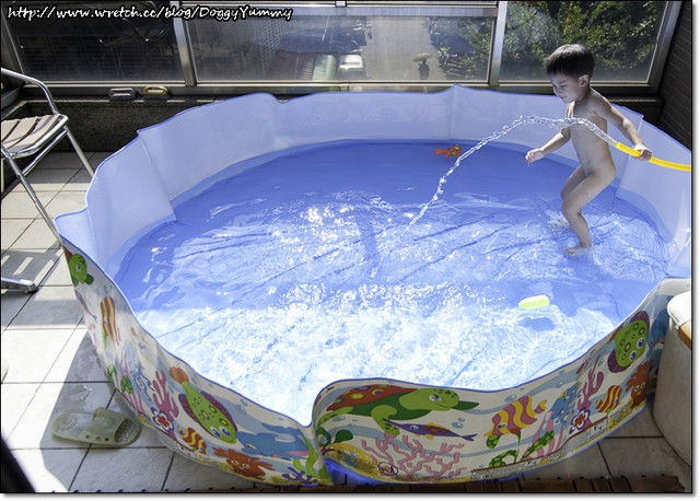 我家也有一個超大的游泳池還有水柱和溜滑梯 搬離婆家的透天厝之後就沒拿出來用了@@
