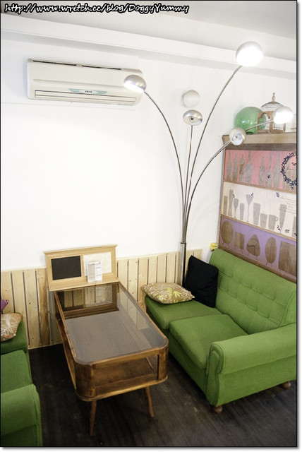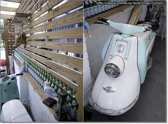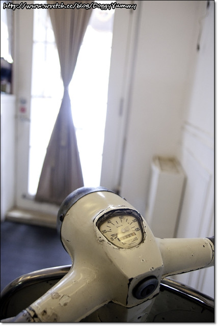 除了門口之外,室內也擺放了一台復古式的偉士牌摩托車~