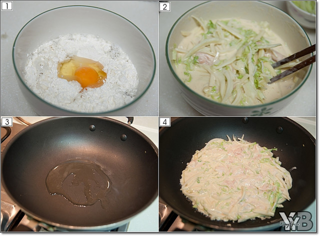 1. 調製麵糊,比例約1杯麵粉加上2/3的白開水、一顆雞蛋和鹽巴,均勻攪拌之後放個10~20分鐘醒麵