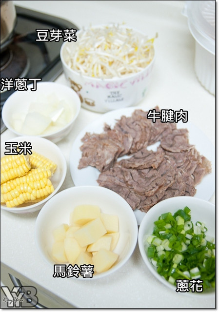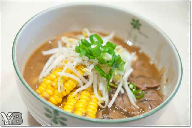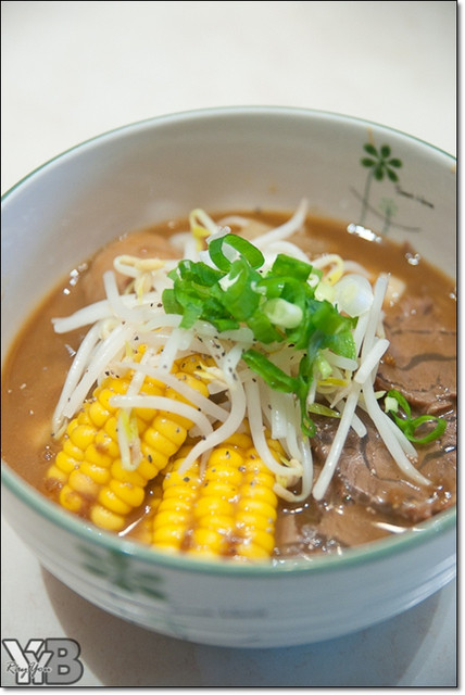 有白色的豆芽、黃色的玉米和深色的牛腱肉~