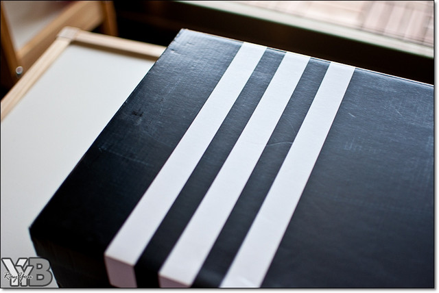 黑底加上三條筆直白色條紋的鞋盒~