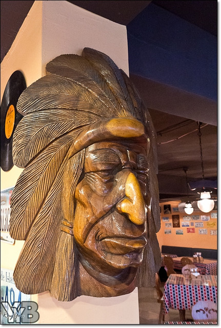 一推開大門就可以看到一個巨型的印地安人頭形木雕~