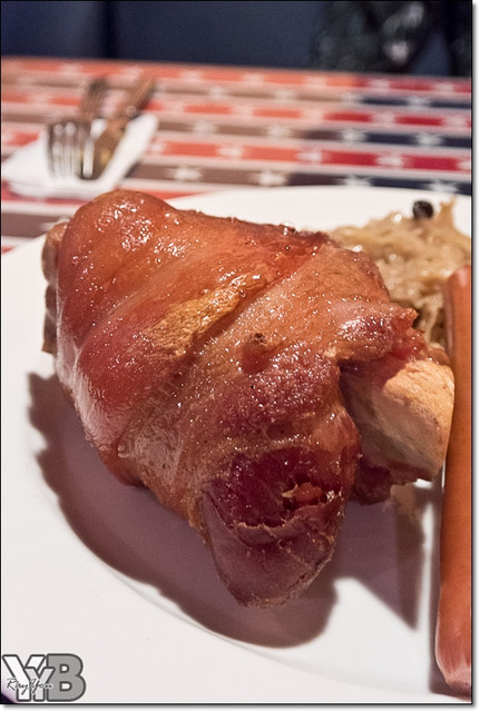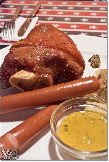 整顆的德國煙燻豬腳再搭配著兩大根的德式肉腸~