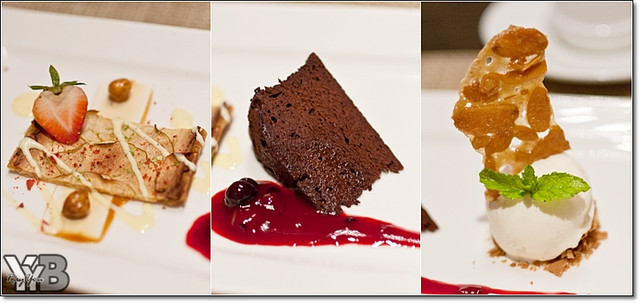 有左至右-草莓千層酥 布朗尼蛋糕 杏仁脆片佐香草冰淇淋