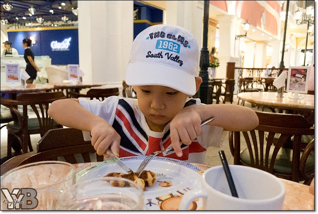 很gay掰的小人YoYo還要學大人切鬆餅,結果切得鬆餅桌上到處跑 XD