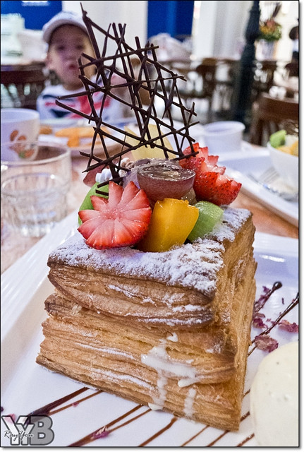 珠寶盒的主體千層起酥派皮堆滿了五顏六色的水果,有夠華麗~